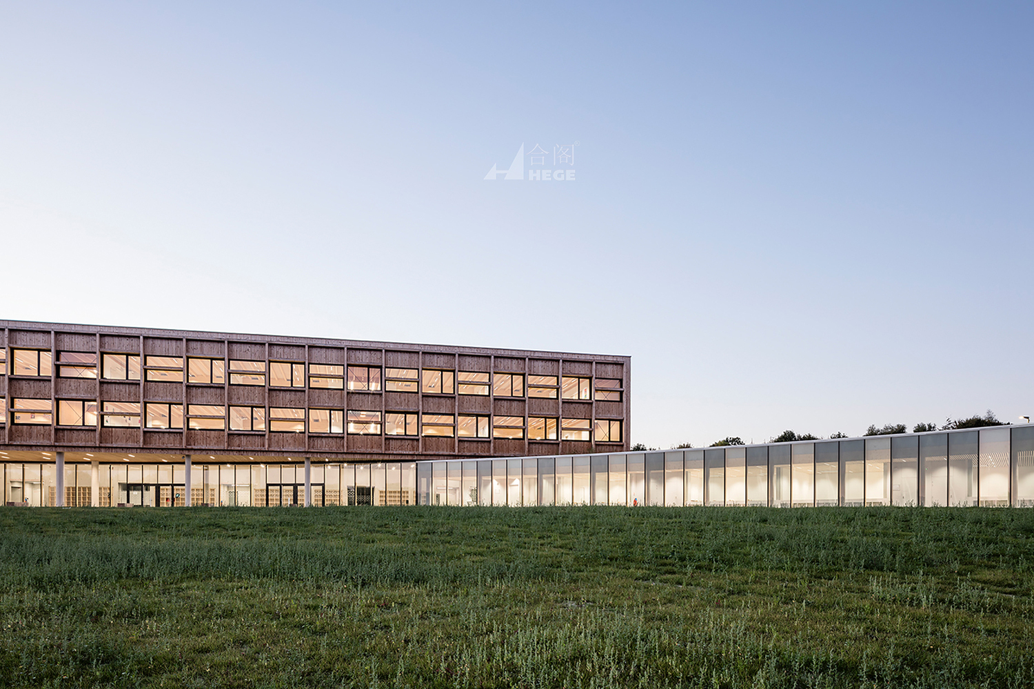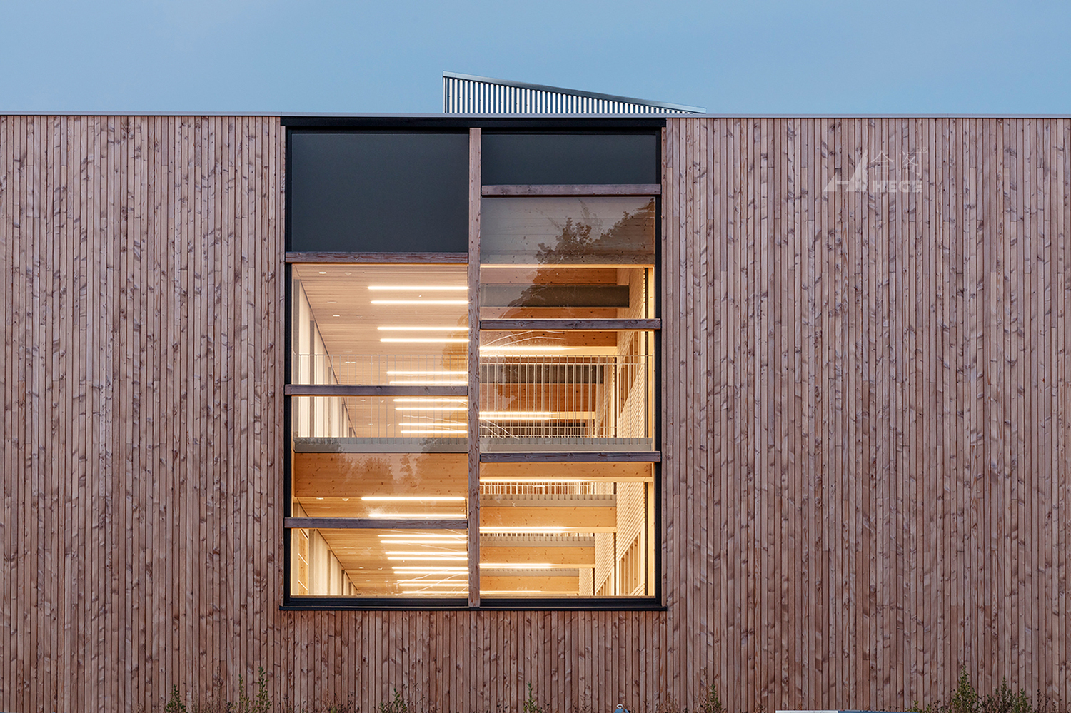 建筑底層的玻璃幕墻給建筑帶來輕盈感。一層容納了入口大廳、風(fēng)雨操場、教育空間、多功能室和食堂。在面向東南和西北的立面上,垂直和水平的木制遮陽板控制著兩層教室的采光量。遮陽板的使用增加了立面的厚度,它們的形狀也豐富線性建筑的形式。