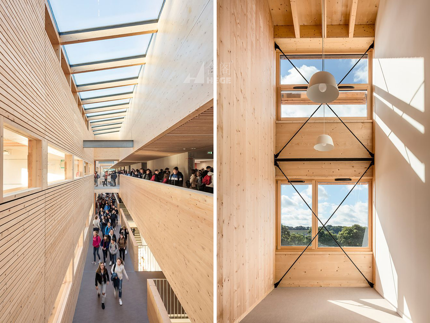 建筑內(nèi)部,一個貫通三層樓的中庭為交通空間和教室提供了自然光,與緊湊的建筑形成對比。