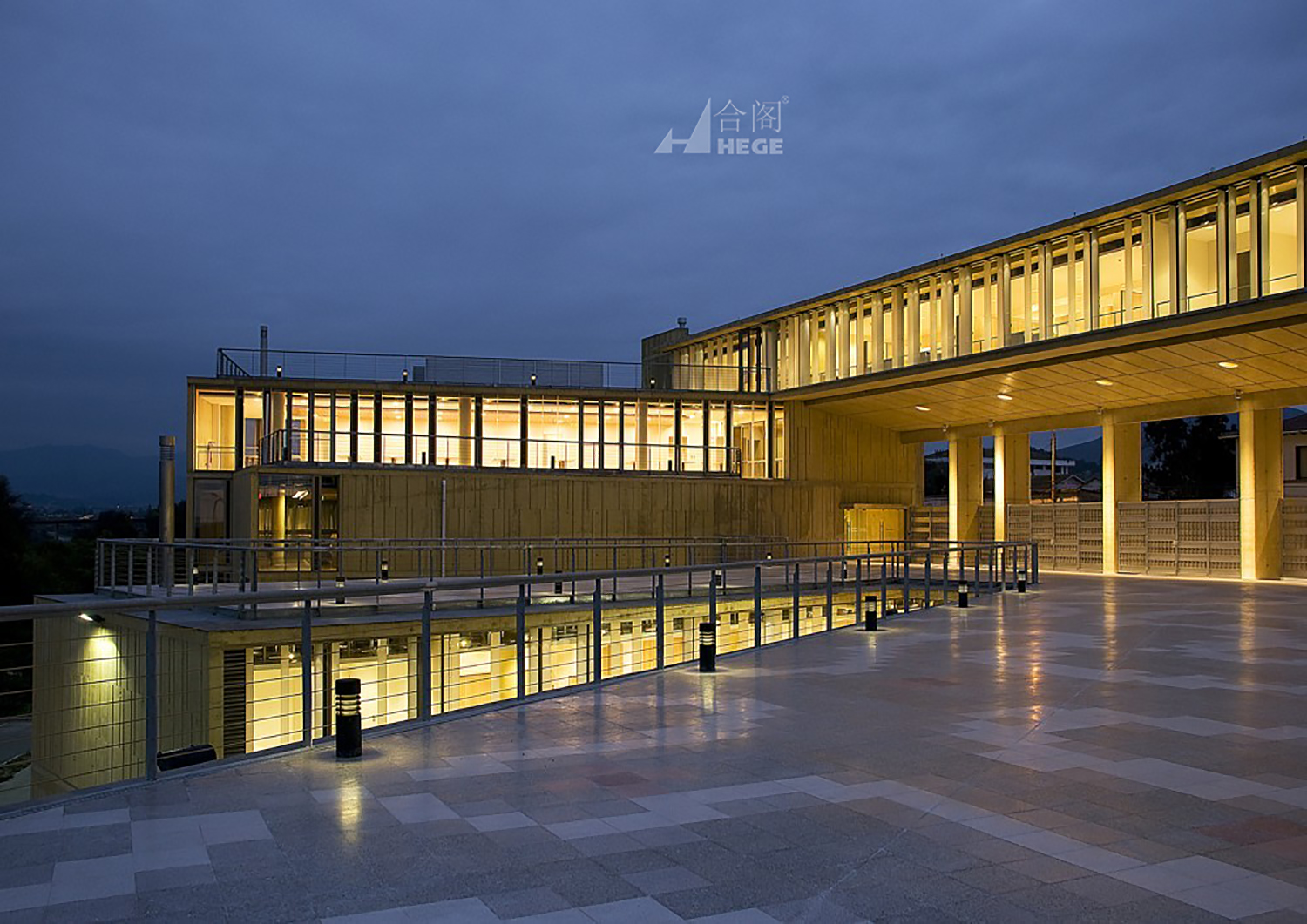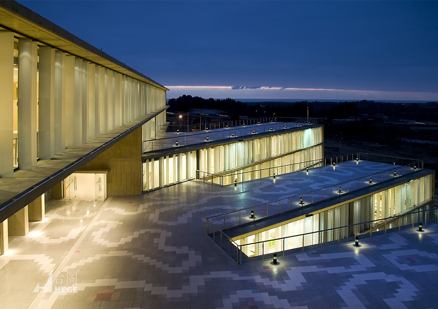 建筑面向在城市與河流間的落客區(qū)分成了幾個體塊,并在其間形成了開放的露臺。這些露臺將河濱景觀引入建筑,恢復(fù)了老城的視廊。兩棟核心建筑被與街道平面連接的部分拱衛(wèi)著。東部的體塊包含大禮堂、多功能廳及在二層的餐廳。餐廳與一個開放的觀景平臺相連。大禮堂占用兩層,因而可以從外部通過上層進入,也可以從內(nèi)部的下層進入。