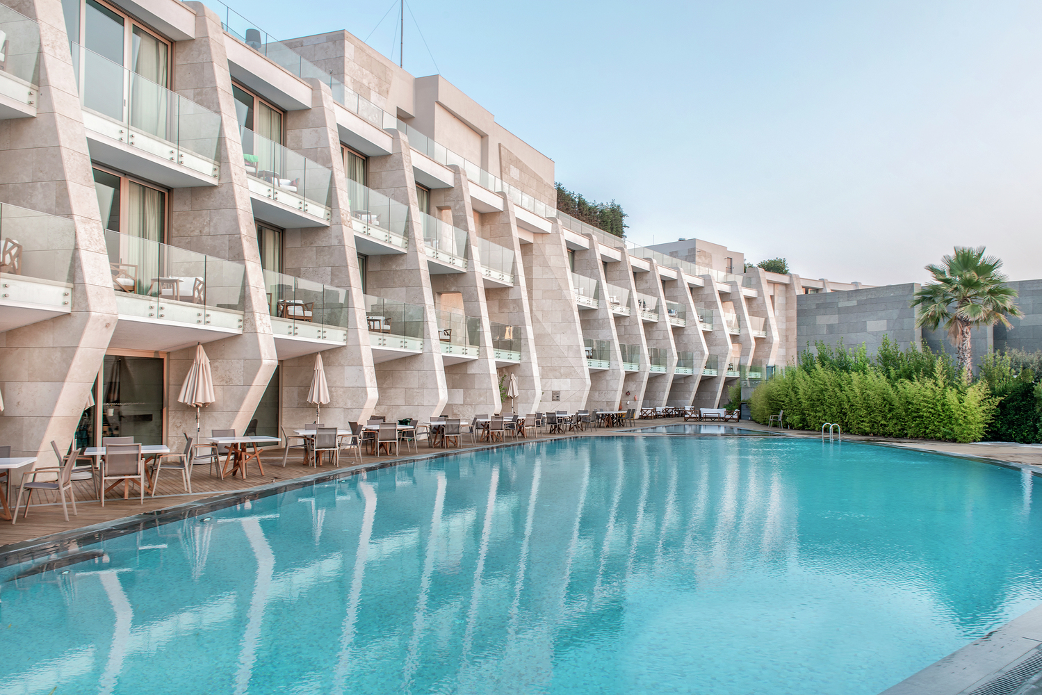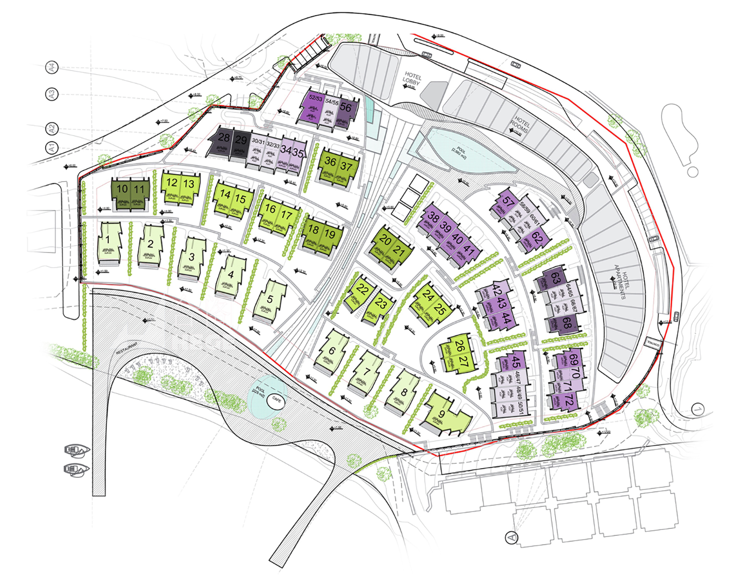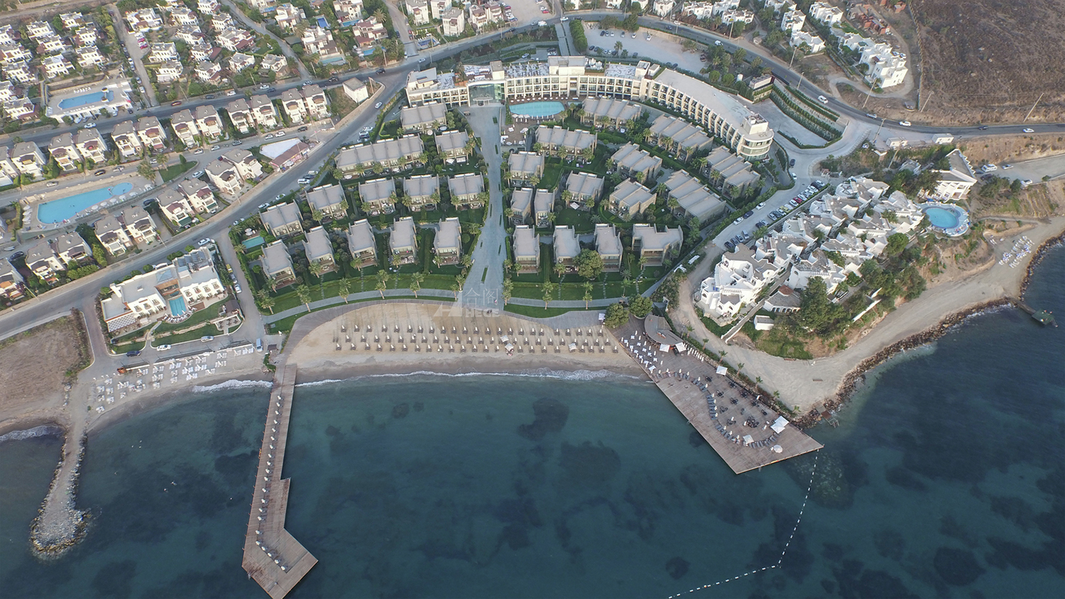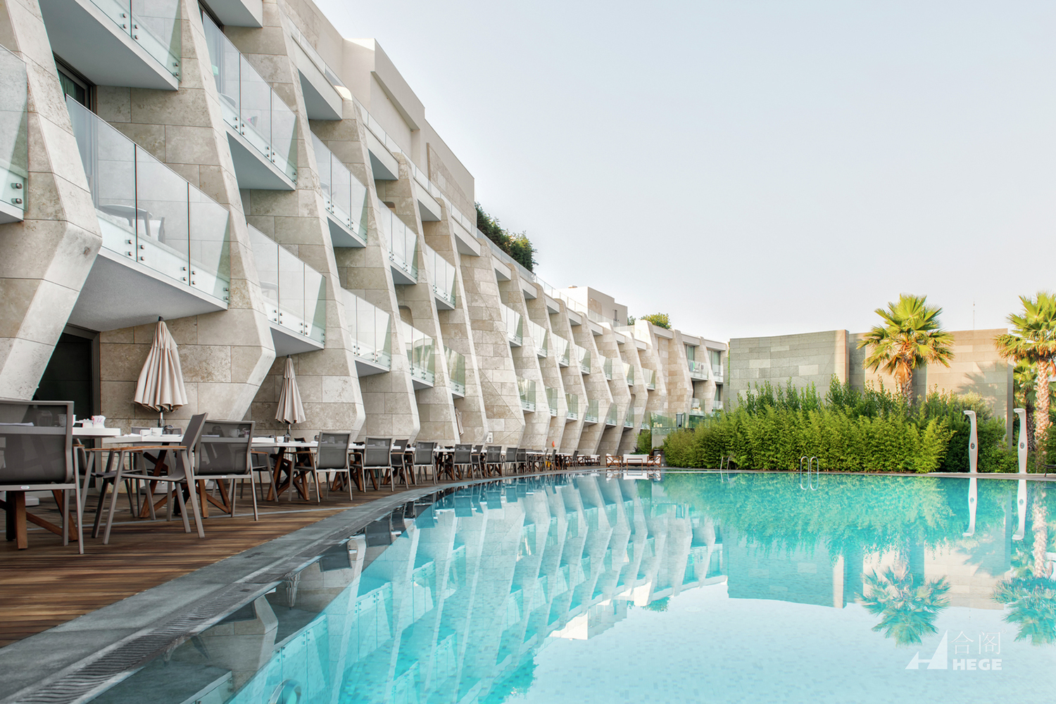 酒店是一個(gè)海灘開發(fā)項(xiàng)目。該項(xiàng)目作為酒店可以容納60個(gè)房間、46個(gè)公寓以及27個(gè)居住別墅,并且包含了spa、健身房和泳池等設(shè)施。酒店具有扭轉(zhuǎn)的結(jié)構(gòu),位于場(chǎng)地的最高點(diǎn),作為了開發(fā)的門面。一條人行道從酒店的大堂直達(dá)海邊,橋狀的懸浮空間末端具有海景餐廳和酒吧,可以直面大海。這一主軸線成為了場(chǎng)地交通的脊椎。公寓和別墅被設(shè)計(jì)在一系列平臺(tái)上,沿海瀑布般展開,提供了最大的可能視野。每一個(gè)別墅在上層是私密的臥室,下層是巨大的起居室以及花園,圍墻退到建筑的一邊,為每一座別墅提供了海景。幕墻為建筑增添了另一層的細(xì)節(jié),并且可以遮擋夏日的陽(yáng)光。