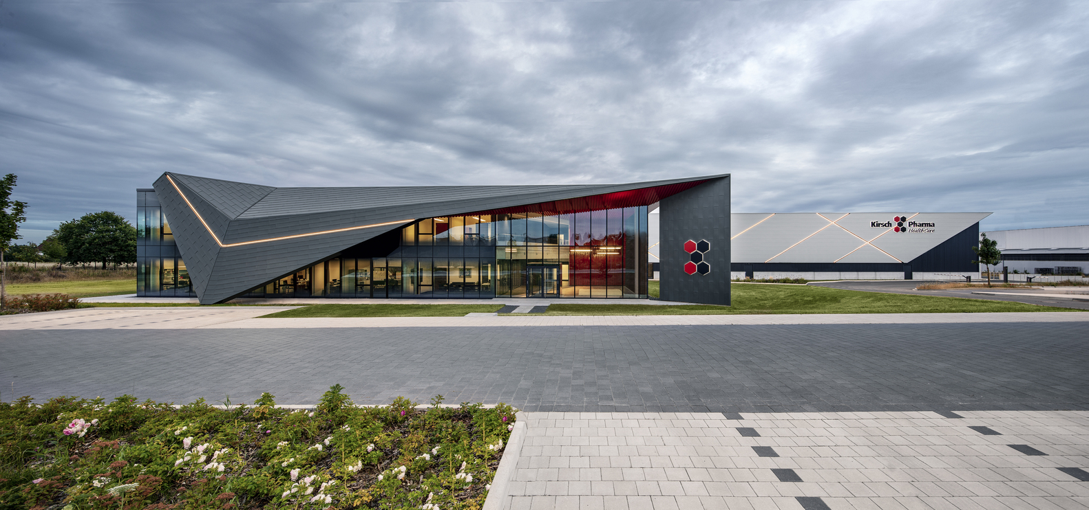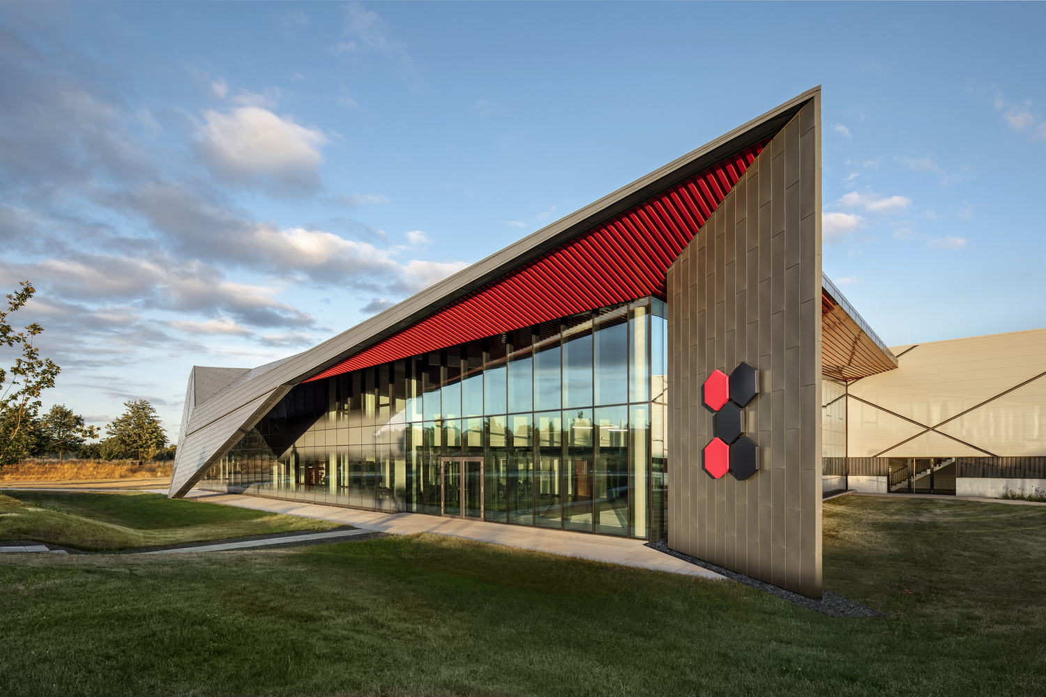 頂篷的棱角和多面形狀,包裹著半透明的三層玻璃幕墻,,同時借鑒了其調(diào)色板,以其標(biāo)志性的質(zhì)量補充和提升了公司的形象。它俯沖的棱角線呼應(yīng)了工廠建筑的切割線,將兩座建筑統(tǒng)一起來。