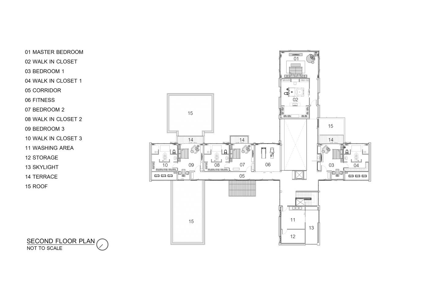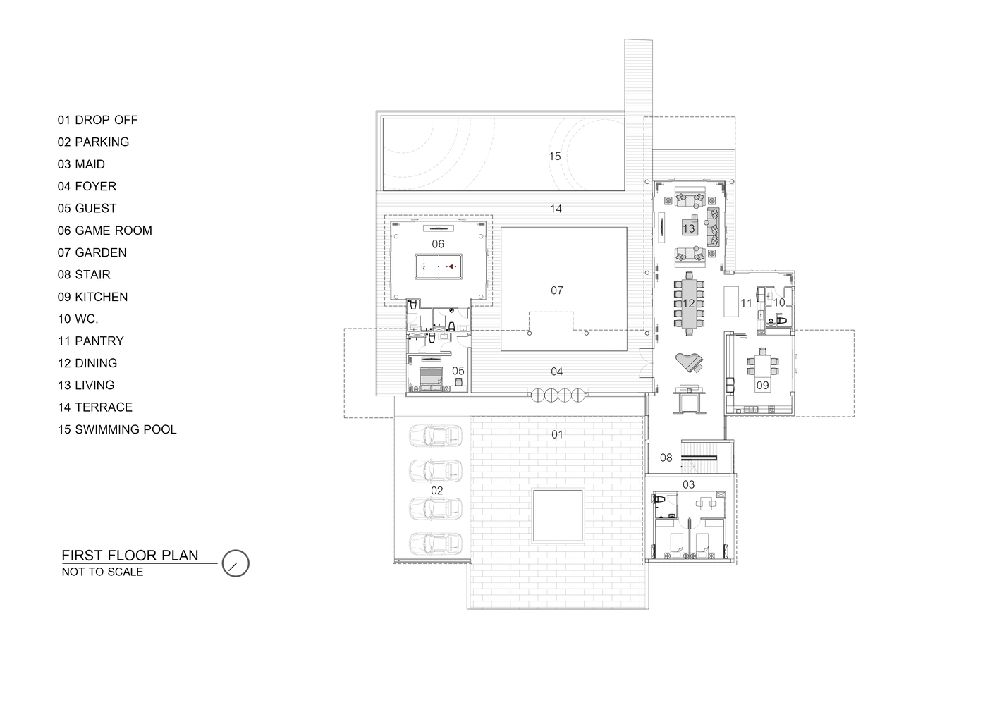 建筑師將起居空間布置在走廊的兩側(cè),看起來(lái)就像建筑的外部區(qū)域。左邊是客房,游戲室。右手邊為家庭的私人區(qū)域,它包括一個(gè)與廚房相連的大客廳,電梯和樓梯通往二樓的4間臥室,包括游戲室和客廳。它的高度超過(guò)3米,可以欣賞外面的景色。