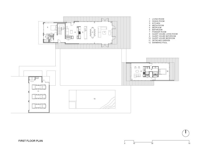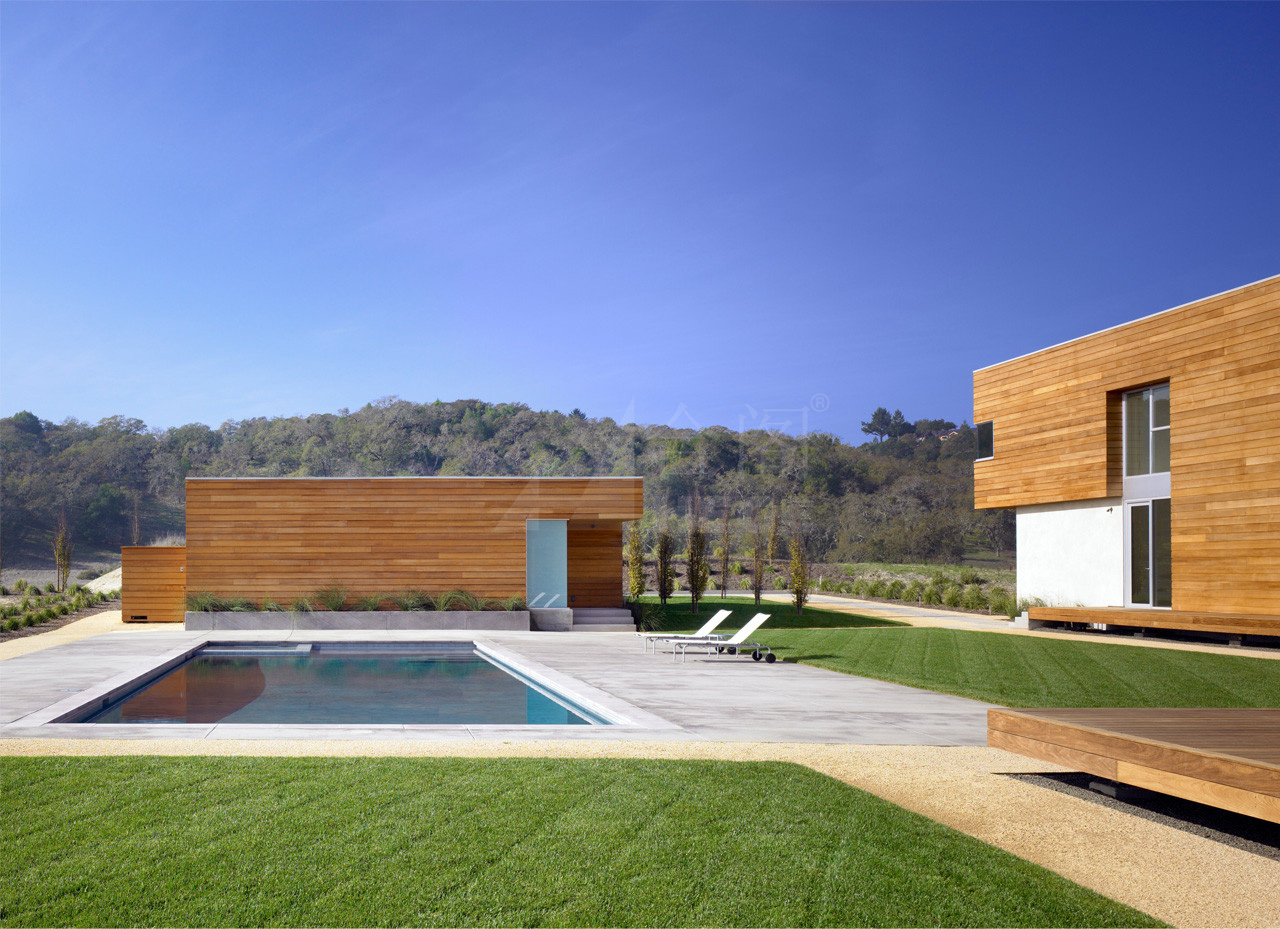 該別墅由三個(gè)獨(dú)立的結(jié)構(gòu)組成,正房,招待所和獨(dú)立車(chē)庫(kù)。這些建筑的朝向設(shè)計(jì)使戶外的空間最大化,連接自然和人工因素。