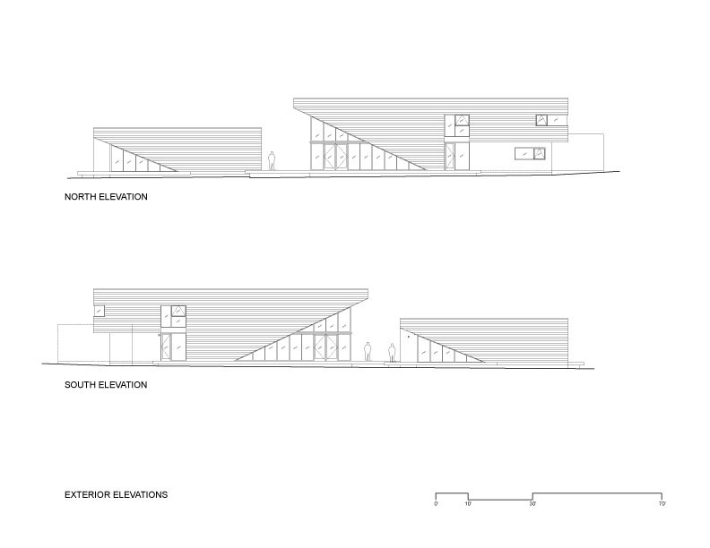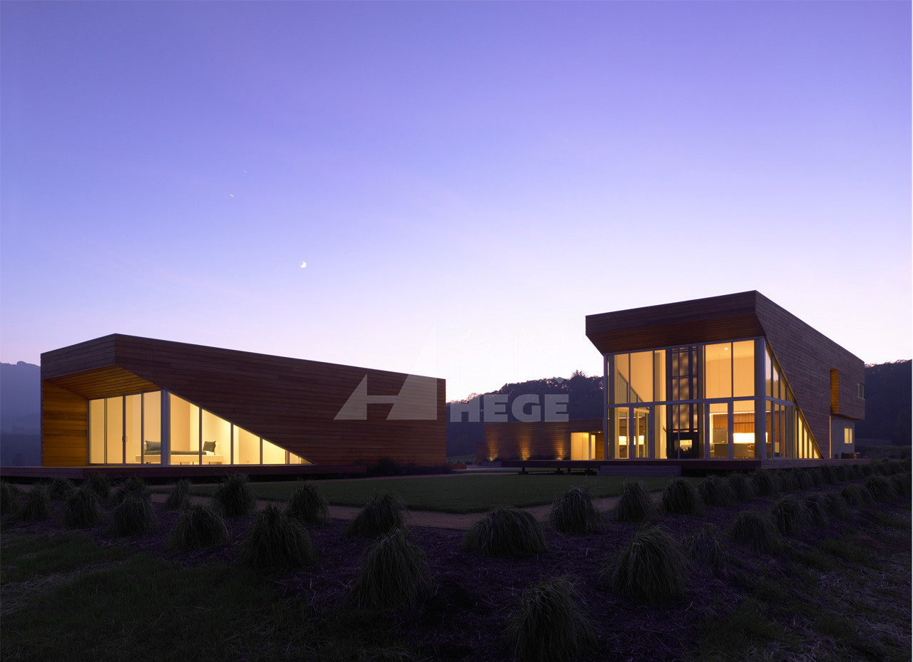 到了晚上,燈光從建筑物的空隙中露出,刺破窗口。從兩個(gè)主要建筑體量的木制屋檐下下能夠看到內(nèi)部的景象。這三個(gè)結(jié)構(gòu)上升為幾何對(duì)應(yīng)于周?chē)纳?。玻璃和清水混凝土以及木頭材質(zhì)暴露在外,創(chuàng)造了獨(dú)特的有地方特色的設(shè)計(jì)。