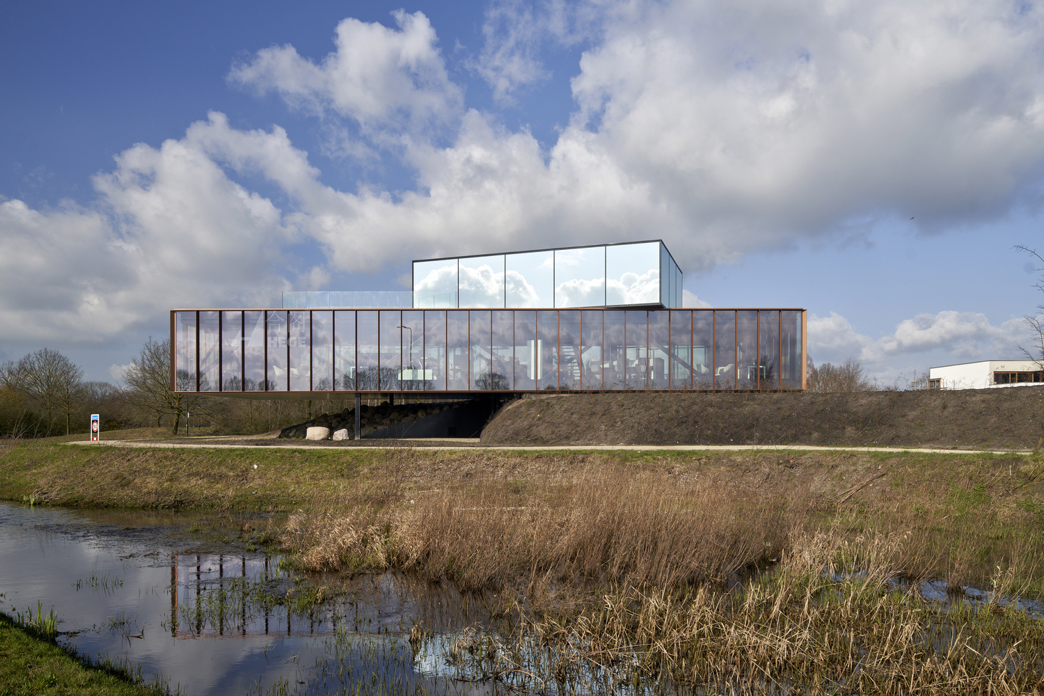 二樓,一個鏡面盒子容納了會議室和餐廳,相鄰的室外空間位于草屋頂之間。
