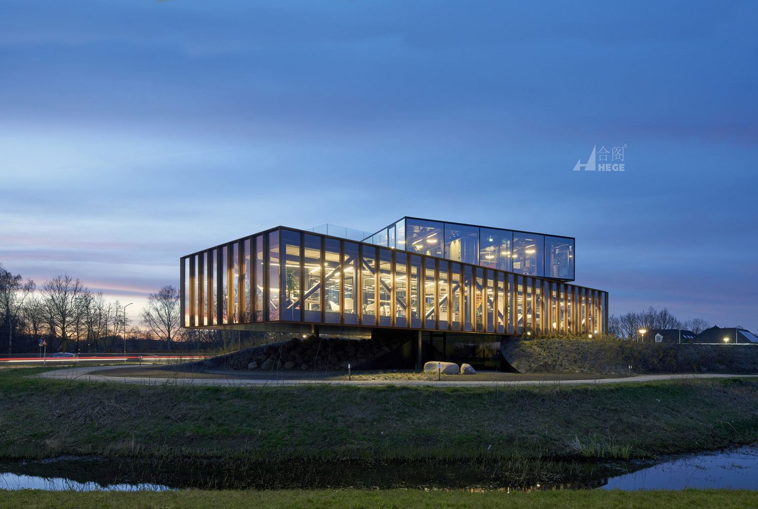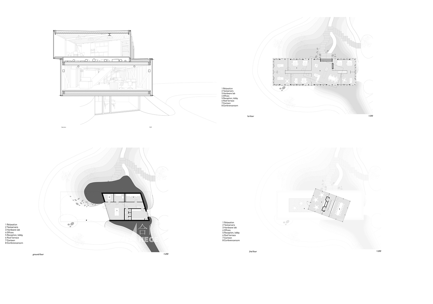 這座建筑有三層。每一層都有其獨特的功能,在室內和室外都可以看到。下沉的一層為辦公室提供支持功能。除了這些服務和存儲設施,音障內還設置了一個公共休閑和視頻游戲區(qū)。
