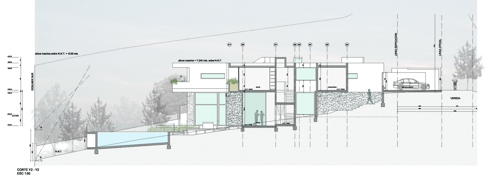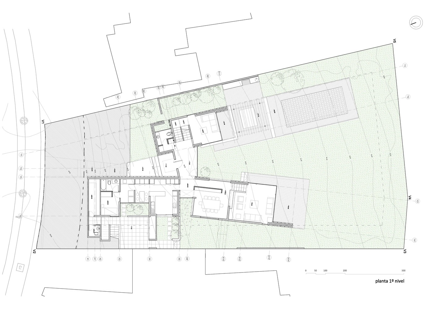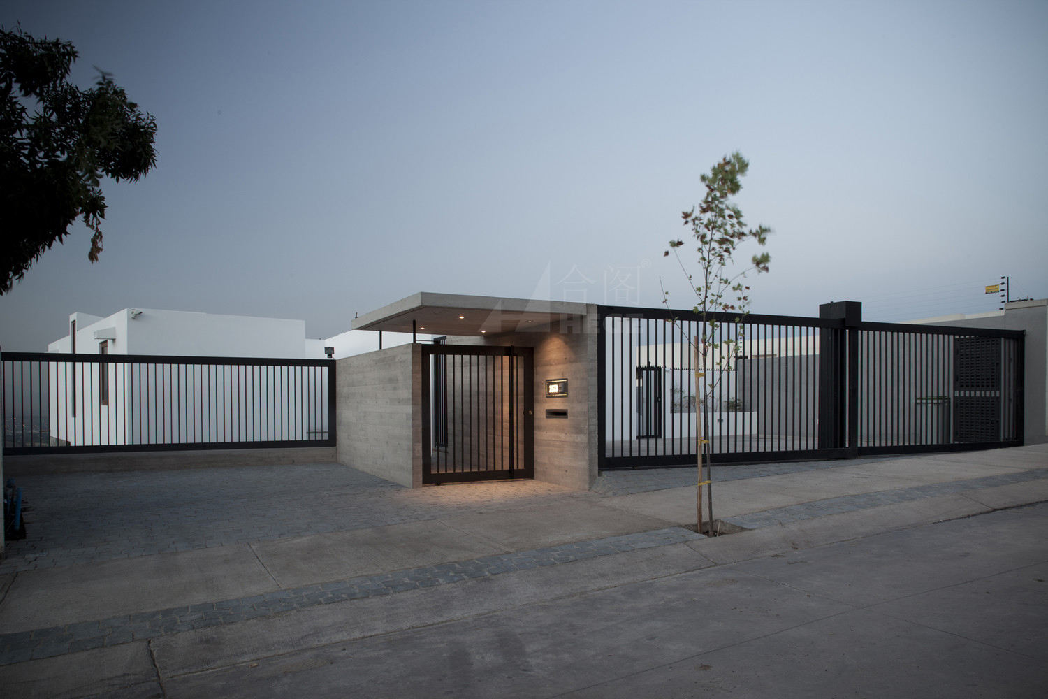 住宅位于一個(gè)形狀非常特殊、帶陡峭斜坡地盤,設(shè)計(jì)師設(shè)計(jì)了兩個(gè)長條形體量,使它們在街道上保持低調(diào)、但像開路一般擴(kuò)張進(jìn)入場地,延伸城市山谷的景觀(東南方向)。較低的高度使其直接與游泳池等室外元素互動,同時(shí)它包含沿著復(fù)雜地形的兩層通高空間與大玻璃窗。入口層由一個(gè)有著干凈白色外表面的配筋砌體下部塑造,所有空間均在同一標(biāo)高。雙層通高大廳連接兩個(gè)構(gòu)成住宅的體量。幾個(gè)庭院及露臺分布在整個(gè)住宅,給業(yè)主一個(gè)身處室外機(jī)會并創(chuàng)造了自然通風(fēng)采光。