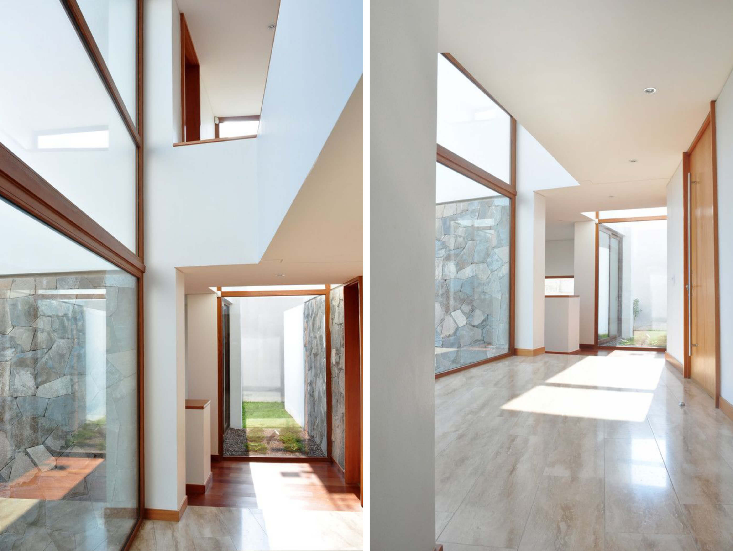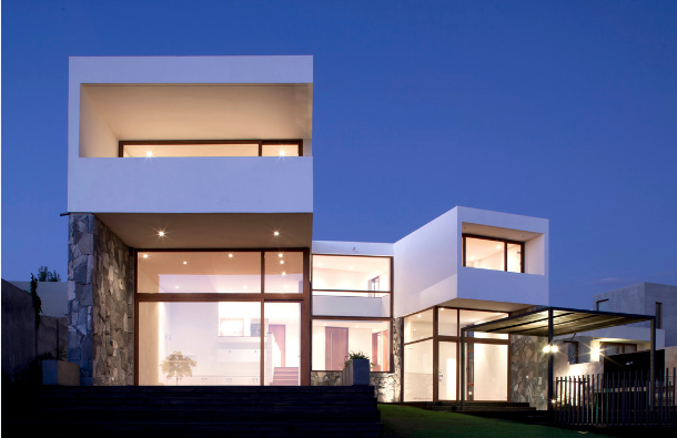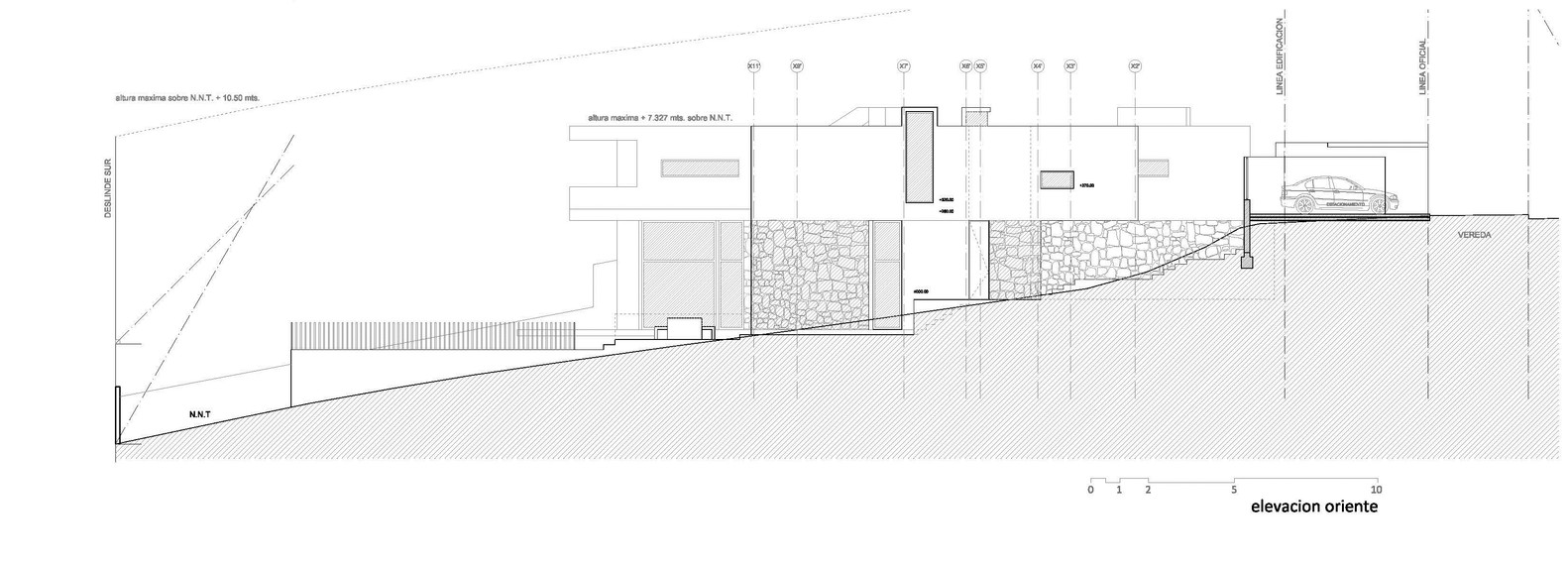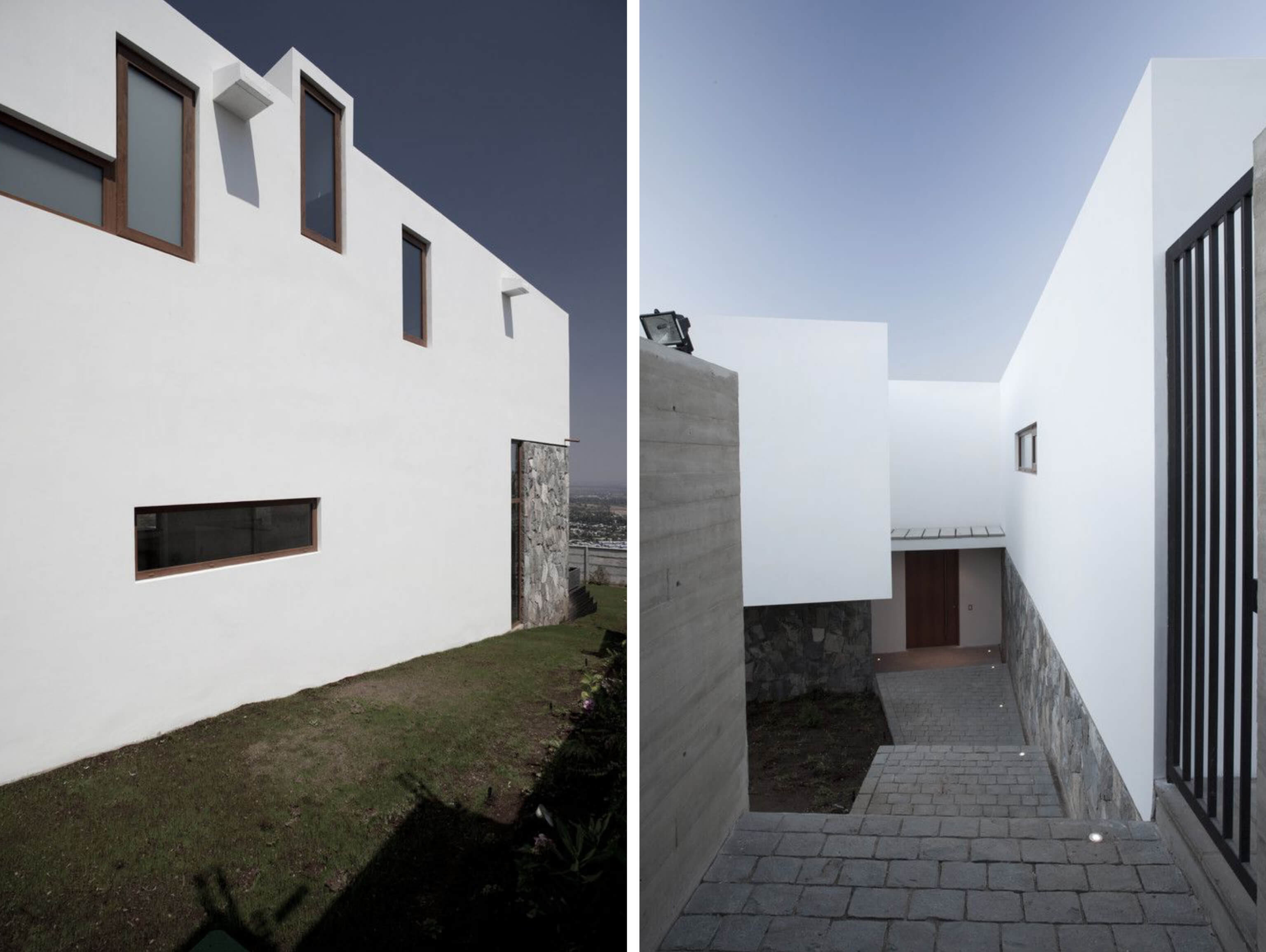 住宅位于一個(gè)形狀非常特殊、帶陡峭斜坡地盤,設(shè)計(jì)師設(shè)計(jì)了兩個(gè)長條形體量,使它們在街道上保持低調(diào)、但像開路一般擴(kuò)張進(jìn)入場地,延伸城市山谷的景觀(東南方向)。較低的高度使其直接與游泳池等室外元素互動,同時(shí)它包含沿著復(fù)雜地形的兩層通高空間與大玻璃窗。入口層由一個(gè)有著干凈白色外表面的配筋砌體下部塑造,所有空間均在同一標(biāo)高。雙層通高大廳連接兩個(gè)構(gòu)成住宅的體量。幾個(gè)庭院及露臺分布在整個(gè)住宅,給業(yè)主一個(gè)身處室外機(jī)會并創(chuàng)造了自然通風(fēng)采光。