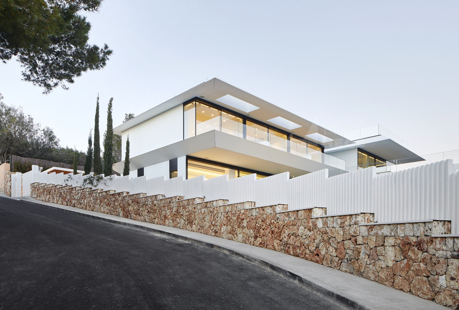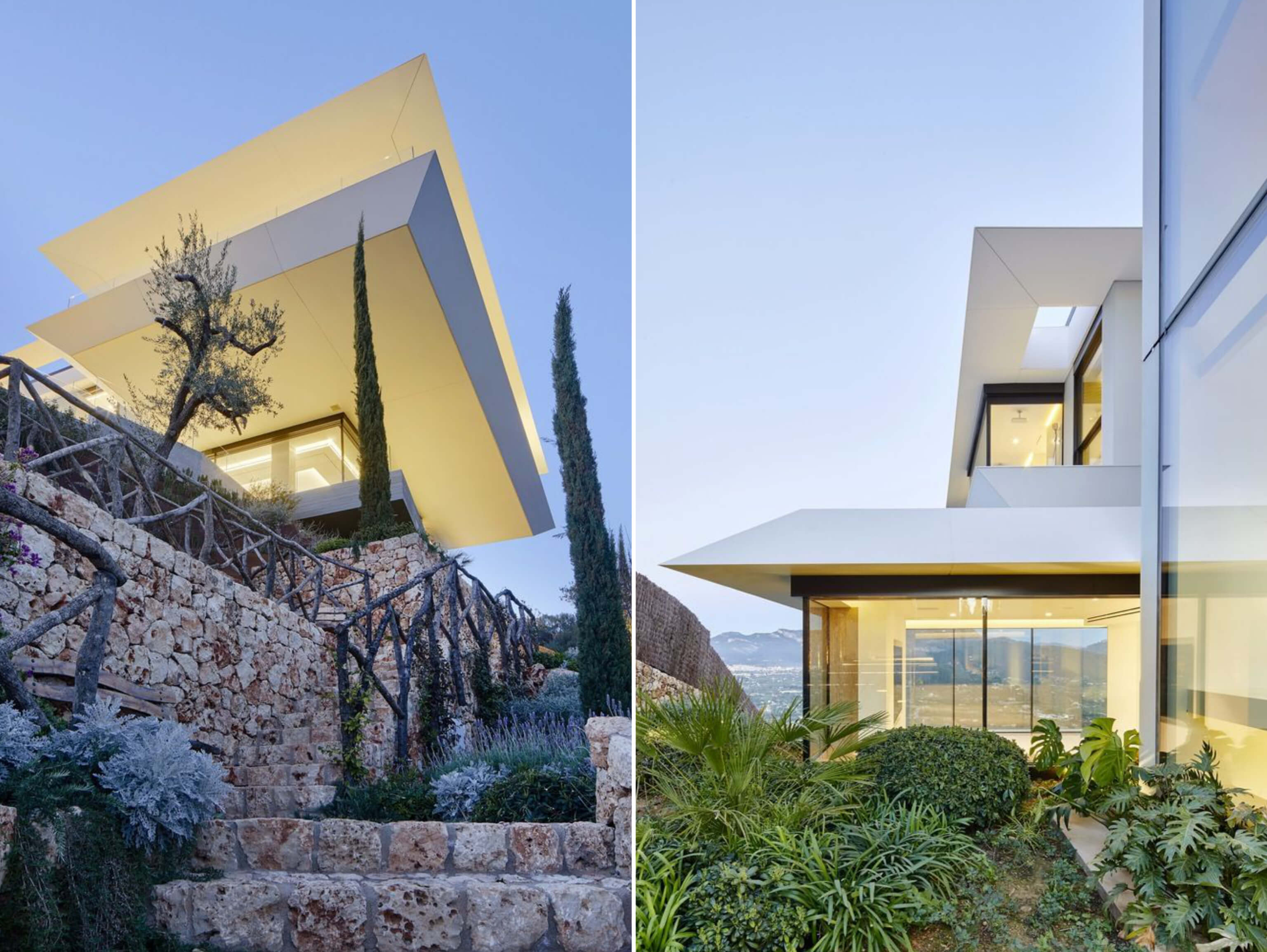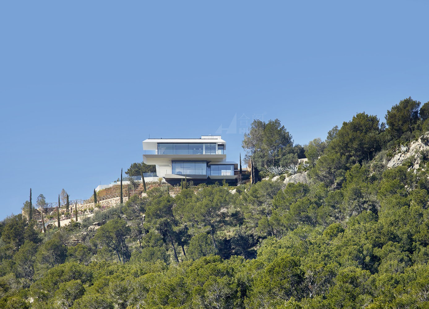 這是一座與天空有著密不可分聯(lián)系的住宅,它駐扎在山上;意圖飛躍遠(yuǎn)離山丘,逃離與地表的自然聯(lián)系。這個(gè)項(xiàng)目設(shè)計(jì)理念源于場(chǎng)地:一座山峰,一片空置的自然景觀場(chǎng)地,有著激動(dòng)人心的地形地勢(shì)與令人贊嘆的景致。一層盡可能抬高遠(yuǎn)離立面,這樣就為地面層提供了天然的遮蔭處。而地面層主要功能為起居空間、廚房和小電視房。因此,起居空間得以免受地中海海島毒辣的陽(yáng)光傷害。這樣一旦進(jìn)入室內(nèi),就會(huì)有令人驚喜的視覺(jué)效果。進(jìn)入室內(nèi),完整的山谷海洋全景一下子躍然眼前。室內(nèi)外之間沒(méi)有界限,有的只是一個(gè)大型的開(kāi)敞休息空間。由于無(wú)限效果的影響,游泳池一下將遠(yuǎn)方的海拉到住宅眼跟前。