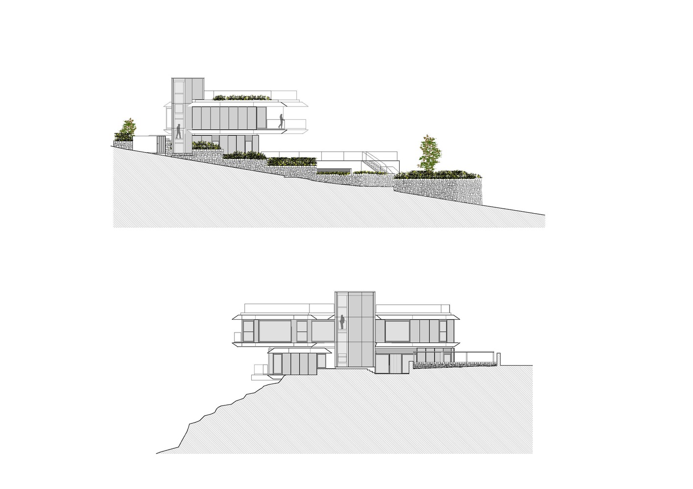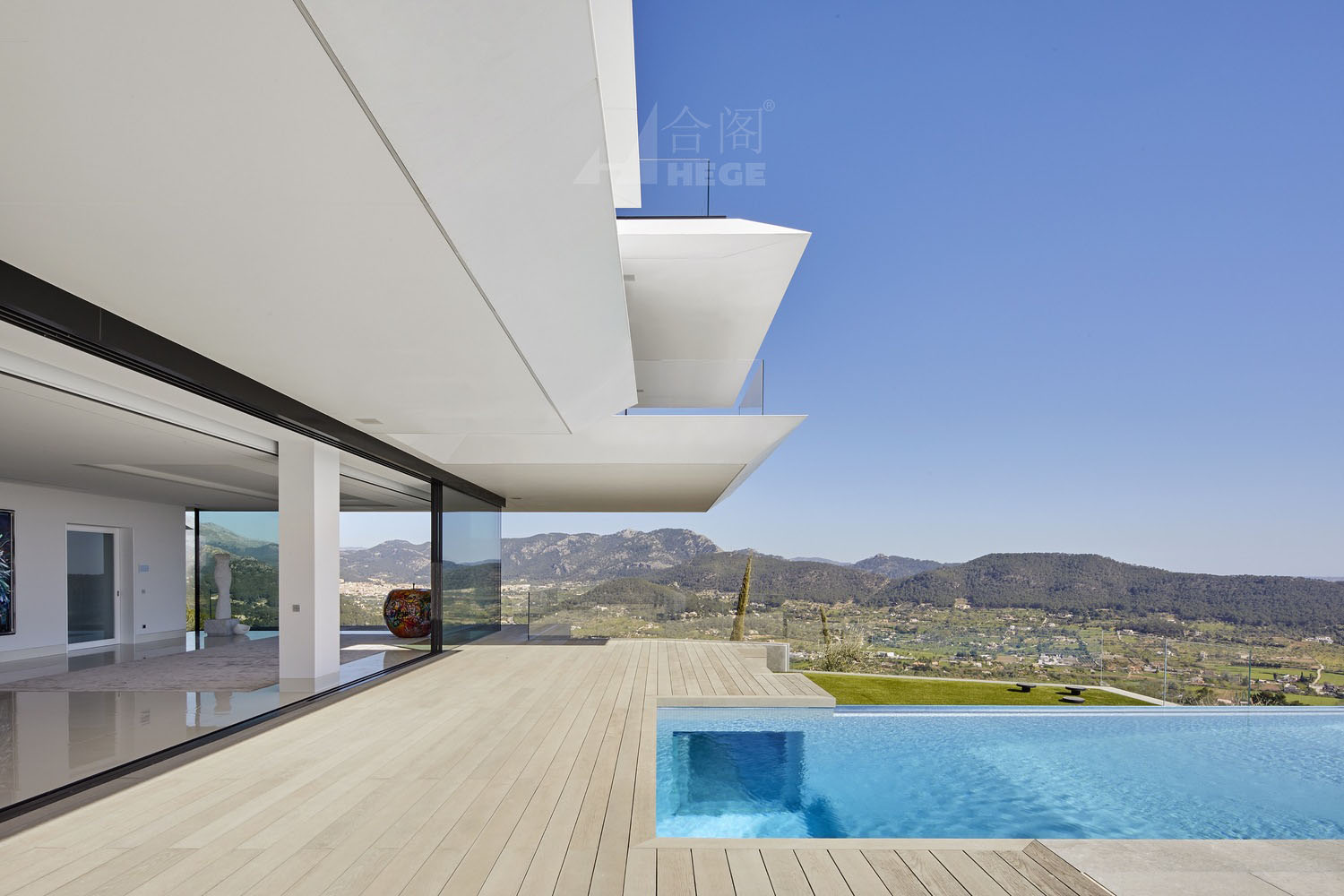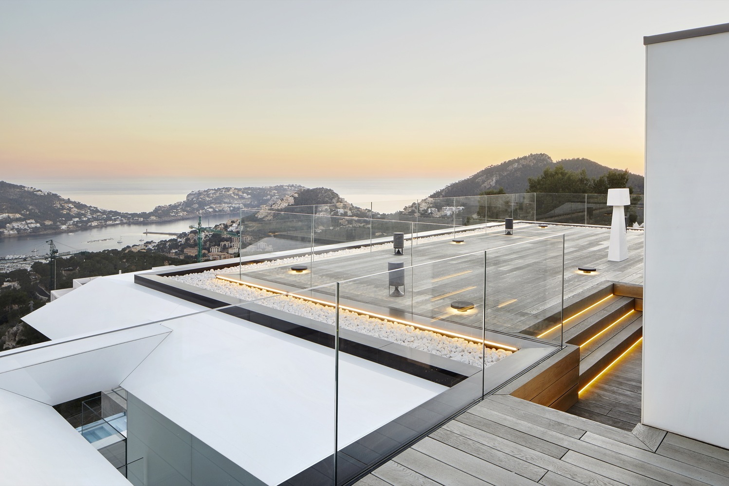 這是一座與天空有著密不可分聯(lián)系的住宅,它駐扎在山上;意圖飛躍遠(yuǎn)離山丘,逃離與地表的自然聯(lián)系。這個(gè)項(xiàng)目設(shè)計(jì)理念源于場(chǎng)地:一座山峰,一片空置的自然景觀場(chǎng)地,有著激動(dòng)人心的地形地勢(shì)與令人贊嘆的景致。一層盡可能抬高遠(yuǎn)離立面,這樣就為地面層提供了天然的遮蔭處。而地面層主要功能為起居空間、廚房和小電視房。因此,起居空間得以免受地中海海島毒辣的陽(yáng)光傷害。這樣一旦進(jìn)入室內(nèi),就會(huì)有令人驚喜的視覺(jué)效果。進(jìn)入室內(nèi),完整的山谷海洋全景一下子躍然眼前。室內(nèi)外之間沒(méi)有界限,有的只是一個(gè)大型的開(kāi)敞休息空間。由于無(wú)限效果的影響,游泳池一下將遠(yuǎn)方的海拉到住宅眼跟前。