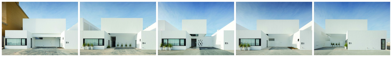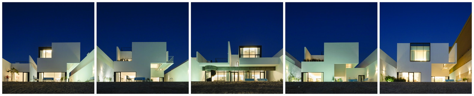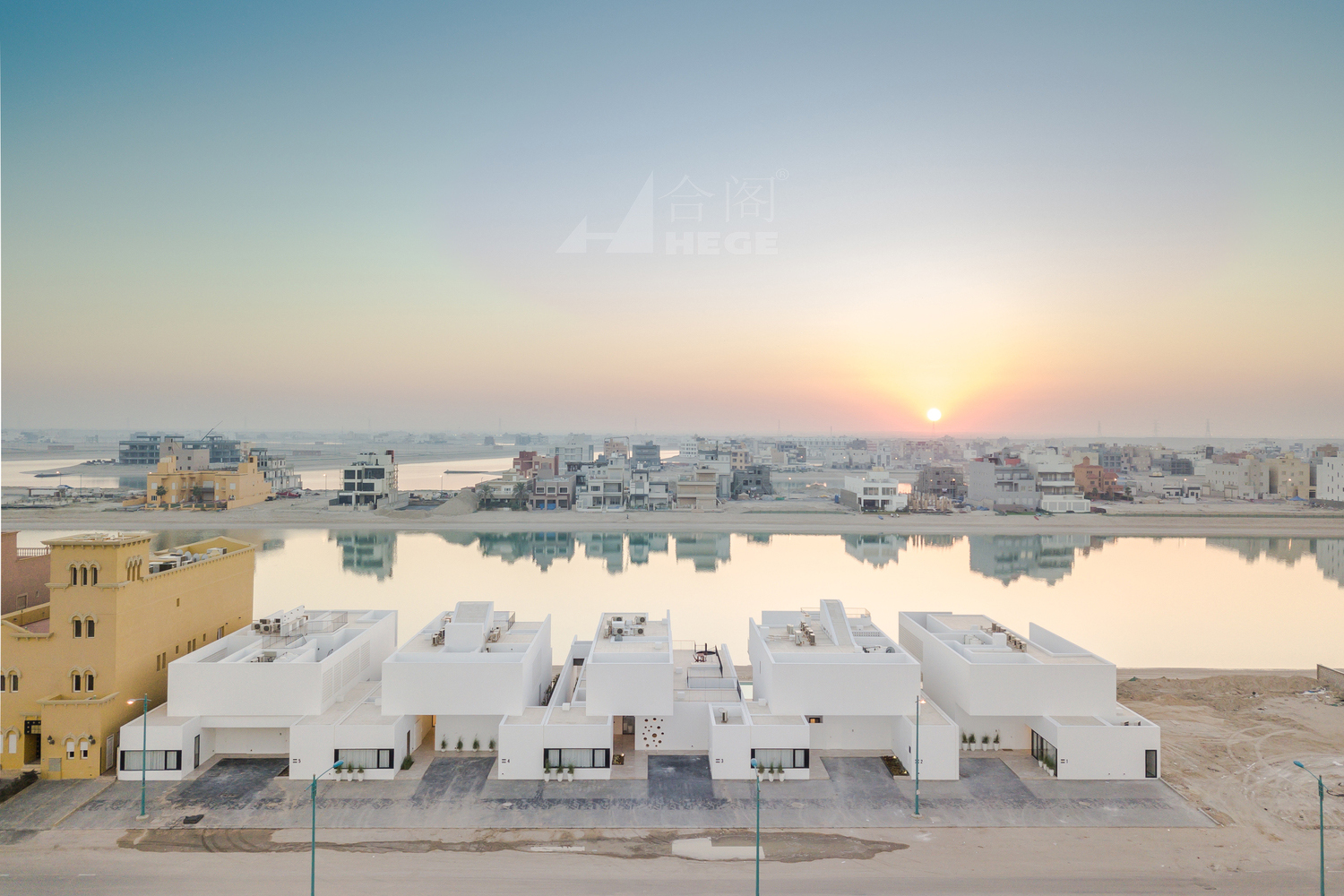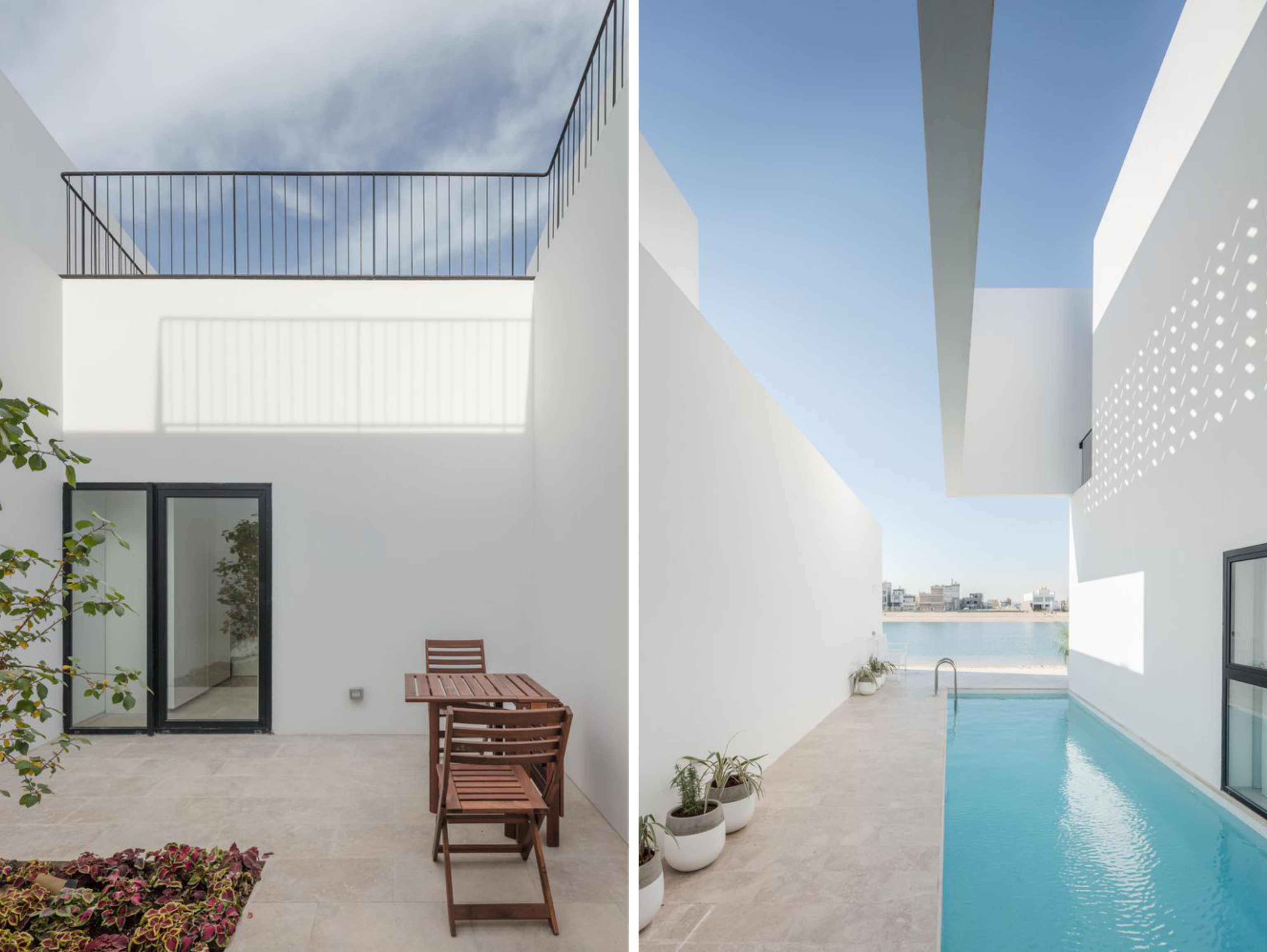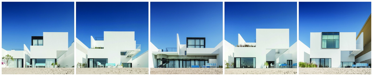 這個(gè)開(kāi)發(fā)項(xiàng)目旨在延長(zhǎng)可可接近的海岸線長(zhǎng)度,讓大海流進(jìn)沙漠,創(chuàng)造出一系列由多個(gè)碼頭和船塢相連的運(yùn)河,并受到許多其他娛樂(lè)活動(dòng)的激活。這五個(gè)住宅的地塊坐落在可俯瞰大海的其中一條內(nèi)運(yùn)河旁。因此將主要日常生活區(qū)與海灘、外部庭院、花園和泳池區(qū)域相連。這些相互連接底層空間讓居住者可以在其間自由穿梭,欣賞運(yùn)河的獨(dú)有景色,使整體空間的流動(dòng)性最大化,并用舒適的方式將室內(nèi)外聯(lián)系起來(lái),某種意義上突破了地塊限制。在地塊的另一側(cè),在入口旁邊是為客人提供的一個(gè)正式社交聚會(huì)場(chǎng)所。