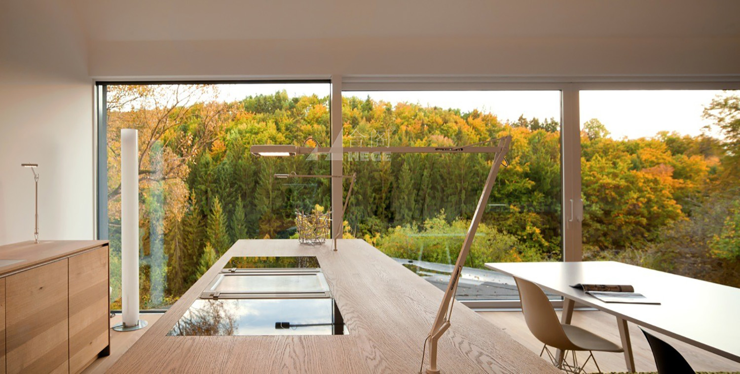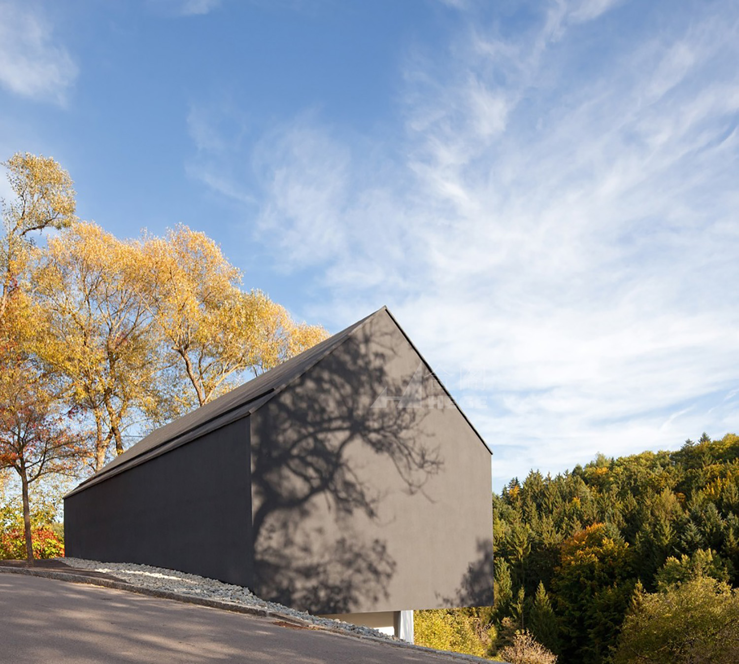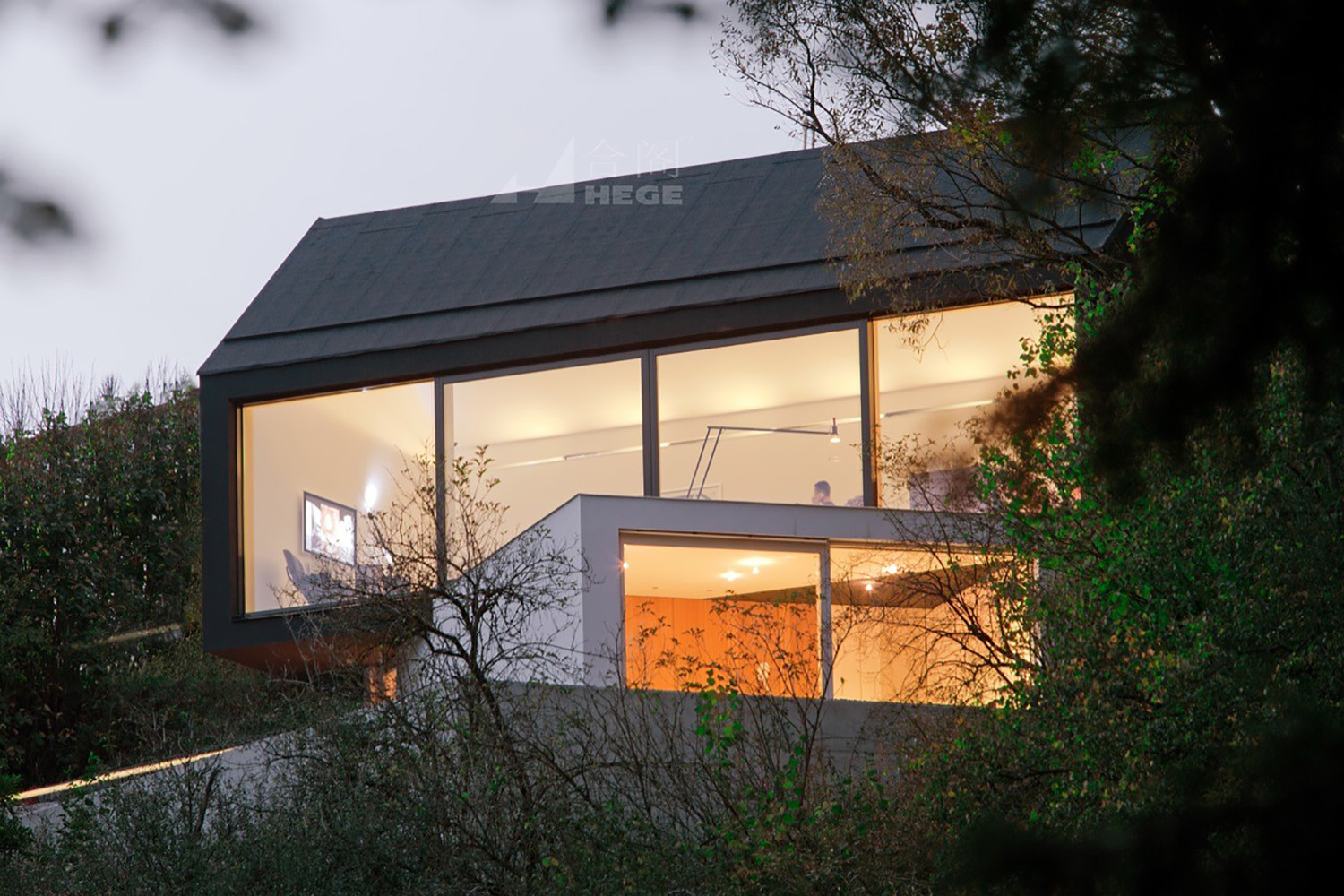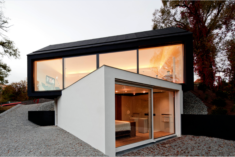 該住宅由兩個(gè)建筑體塊組成——一個(gè)均勻的黑色馬鞍狀屋頂建筑傾斜著,懸挑在一個(gè)白色的平屋頂盒子上。這些體量面向自然空間和森林,建筑與周圍的環(huán)境相比顯得安靜而簡潔。光線可以通過中間的樓梯照射到室內(nèi),自然帶來的溫暖給人一種與自然親密接觸而溫馨的感覺。房子內(nèi)部包括休息室,一個(gè)客廳,洗手間和臥室。房子運(yùn)用大片玻璃,早上可以享受到自然帶來的光線和溫度,而且?guī)Ыo人一種通透的感覺,但是只要拉上窗簾,房間仍然保持私密性。晚上房子內(nèi)部的燈光從從玻璃透出,就像一雙明亮而溫純的眼睛在夜間靜謐地綻放。